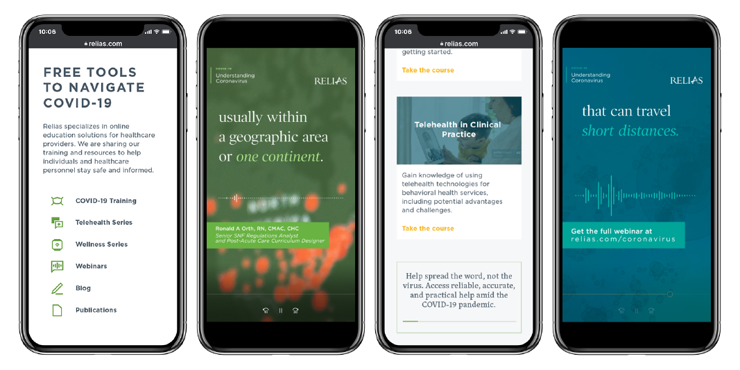 Problem: A digital campaign from motion graphics, marketing, landing pages and eLearning content to assist medical professionals in navigating the Covid-19 pandemic. Since Relias specializes in education solutions for healthcare providers it was important to provide them with all the tools necessary to be informed at the beginning of the pandemic. This included elearning content about what COVID-19 was, marketing content for both mobile and desktop users, and landing pages to direct providers to our suite of resources.